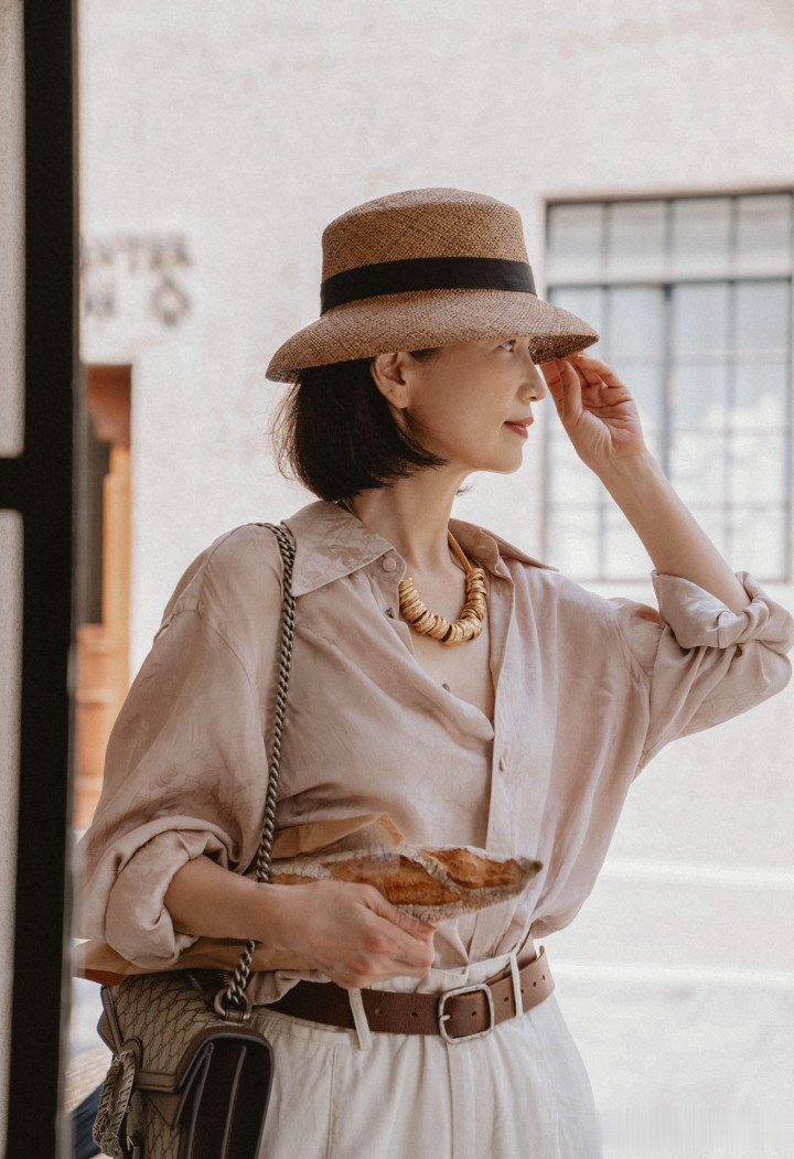 在基础款的继承上,她偏疼剪裁利落的衬衫、诚恳衫和直筒裤。这些单品看似闲居,却通过面料的雅致质感、样子的轻柔过渡、细节的高明计算,透出岁月千里淀的沉静。比如她常穿的米白色亚麻衬衫,领口微微掀开造成V型,既修饰了颈部线条,又透出慵懒的圭臬风情。