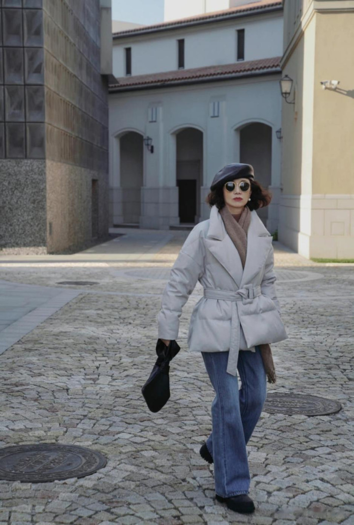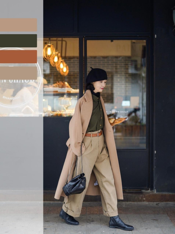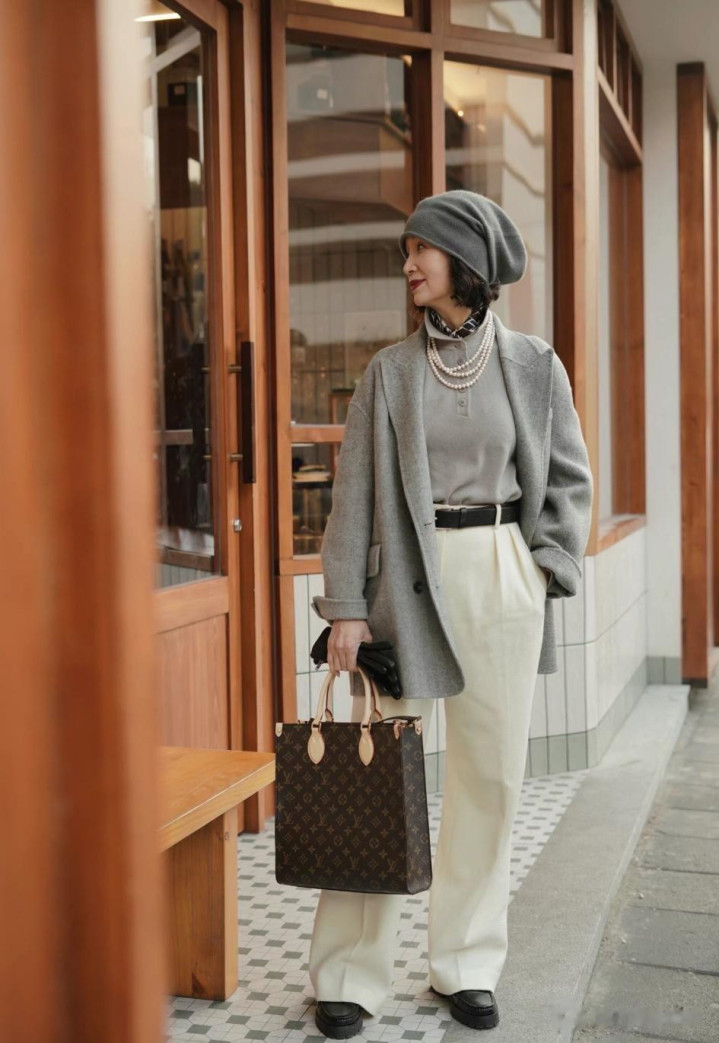更令东说念主称许的是她对颜色的把控。她偏疼低裕如度的莫兰迪色系,这种颜色体系既合适中老年女性的气质需求,又透出高档感。但更妙的是她对颜色的头绪期骗——比如用雾霾蓝大衣配浅灰诚恳衫,再搭一条米白领巾,这种同色系渐变搭配既和谐又有头绪。